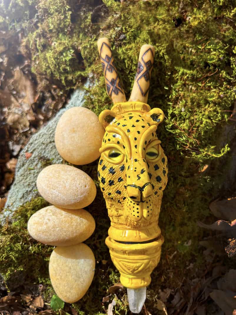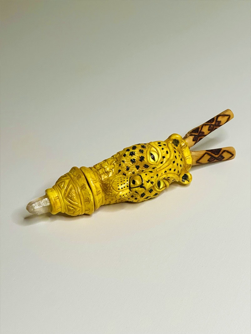 The handcrafted Tiger Kuripe, one of the animal-inspired kuripes in our collection, is meticulously created by the Huni Kuin family from Rio Branco, Acre, Brazil. Known for their mastery in crafting kuripes and Tepes, the Huni Kuin artist behind this piece brings a deep cultural legacy, and we are honored to support this beautiful partnership. Each Kuripe is an authentic, handcrafted treasure that comes with its own Hapé holder, ensuring the complete experience. This sacred self-applicator serves as a conduit for delivering Hapé medicine directly into one’s nostrils. As you use this Kuripe, your breath becomes a powerful channel, carrying intention and the potent medicine of Hapé to harmonize your body, mind, and spirit. With each blow, you forge a deeper connection to the prayers and energies of the Huni Kuin people.